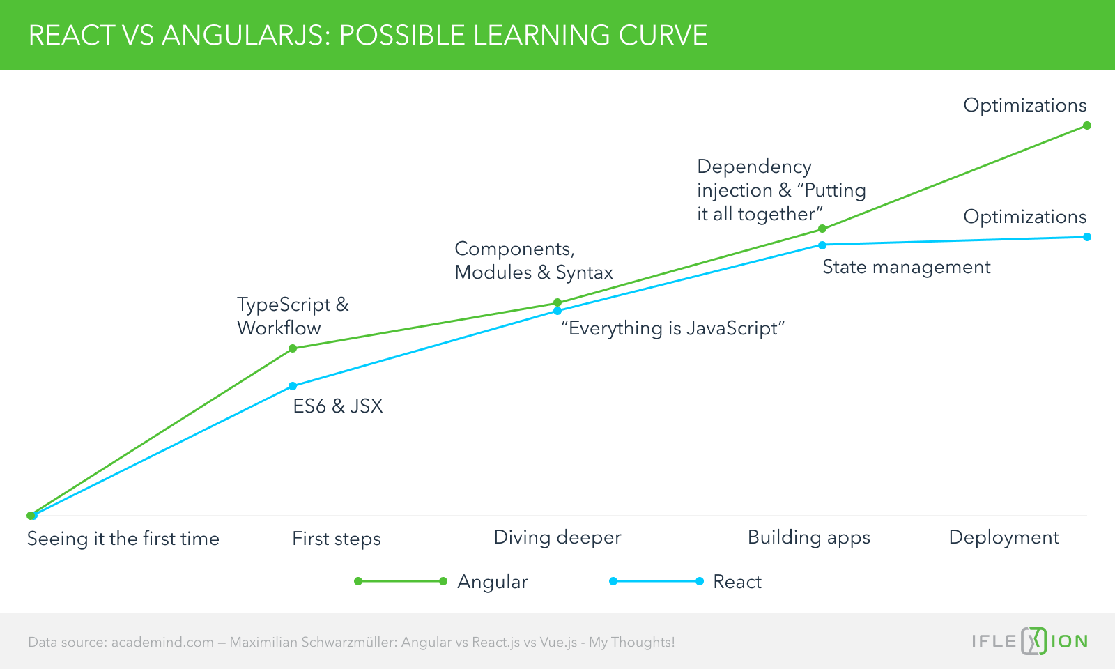 Angular has a steep learning curve due to its vast library, and learning all the concepts takes much more time as compared to the React. Angular IO framework offers different ways to solve a specific problem. It has a complex component management system, and it is essential for developers to be familiar with different concepts and languages like TypeScript, templates, dependency injection, RxJS, etc.